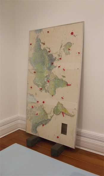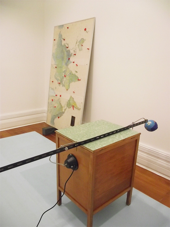 In Paul Cullen’s exhibition, HTWW: devices, a modified world map, mechanical contrivances, and sets of diagrams are deployed through the gallery spaces.