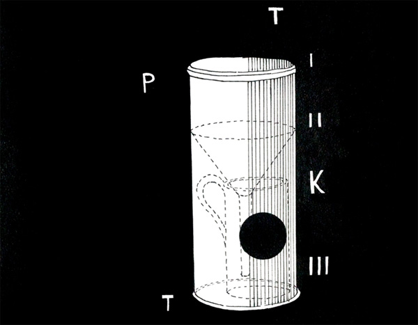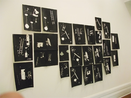 Cullen’s sculptural works are assemblages of objects too – chairs, tables, and world globes – directed towards a purposive purposelessness. In his diagrammatic drawings we find ladders, chairs, tape measures and laboratory flasks, grouped, coded and annotated.