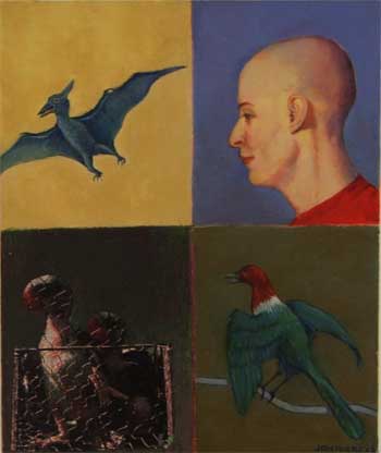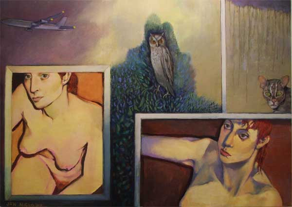 Burton’s Alice is 19 years of age. Ken Ralston, Senior Visual Affects Supervisor said of the film “we are just trying to put you right in the middle of this strange world and take you on this journey”. An apt time then to revisit Jan Nigro’s Alice, a young New Zealander in her 30s travelling overseas” For Nigro’s Alice New Zealand is wonderland, and in her paintings Alice moves from contemplating her journey, to the journey itself, and facing choices that awaken her to new thoughts and ideas. As in Carroll’s Alice Nigro’s Alice is accompanied by various animals, some passive and watching others threatening. A lot has been said of the place of painting and narrative in art today; it has been in practice for thousands of years and as in film the strength of the story is in the narrative and the innovation is found in the presentation. Nigro shows painting allows for both as she borrows from Lewis Carroll and creates a strong suite of works that are topical and challenging. Confirming as Dr Robin Woodward says, her “place as one New Zealand’s foremost figurative painters.”