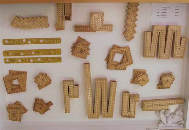 One Metre 1997 is a suite of small table top or wall works developed literally from one metre rulers. In 1998 they developed into Building Sculptures, small wall mounted works. By 2004 they had morphed into Untitled Rulers. The exploration of the form continues but Cullen now maintains the measurement structure of 0 - 100 cm. The more recent variation of his ruler works are the Ruler Reductions, where the rule is now penetrated by holes.