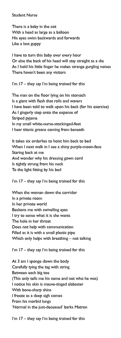 The Student Nurse is a compassionate poem, which utilises figurative language to express modes of communication in unusual forms such as the eyes [that] swim backwards and forwards like a lost guppy, or the titanic groans of a man in striped pyjamas, or the woman who beckons me with swivelling eyes, or the tag tied to the big toe that does not really tell you who that person was.