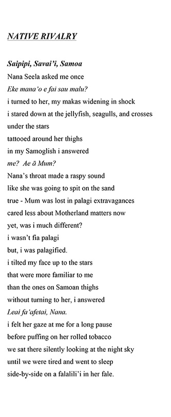 Native Rivalry is a touching and thought provoking response to the perceived ‘fall from grace’ of the modern Samoan, by an author who is clever enough to both draw us into the most private place of contemplation, while also maintaining the distance of observation – almost as if we are looking too, along with Savai’i, across the same waters that separate us from the debauchery noise of partygoers.