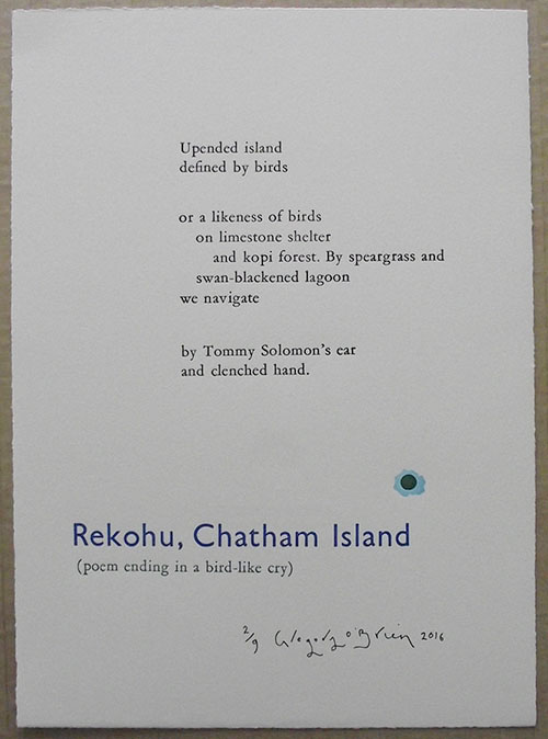 Brendan O’Brien has been printing for over two decades now having bought his first press printing press in 1993. Between 2000-2002 he was the resident artist at the Rita Angus Cottage, during which time he established his Fernbank Studio imprint for hand-printed books. The name derives from the cottage Angus lived in. In 2005 as the Printer in Residence at Otago University he collaborated with Ralph Hotere and Bill Manhire to hand-print an edition of the ‘Pine’ poems. In July 2015, Brendan returned to Otago University as the University Library Printer in Residence to handprint a limited edition of 100 copies of ??????????? (Eighteen) poems from ancient Greek texts translated by, the 2013-2015 New Zealand Poet Laureate Vincent O’Sullivan with illustrations by Barry Cleavin.