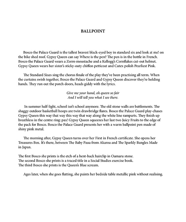 I loved this poem from the first reading. It has whimsy, a lightness of touch and lovely details. Who doesn’t want to be the Gypsy Queen and have Bosco the Palace Guard holding one’s hand and declaiming: Give me your hand, oh queen so fair/And I will tell you what I see there. Then running out the porch doors heads giddy with lyrics to create castles in the playground, eat Juicy Fruit and receive a warm, shiny, pink, metal ballpoint!