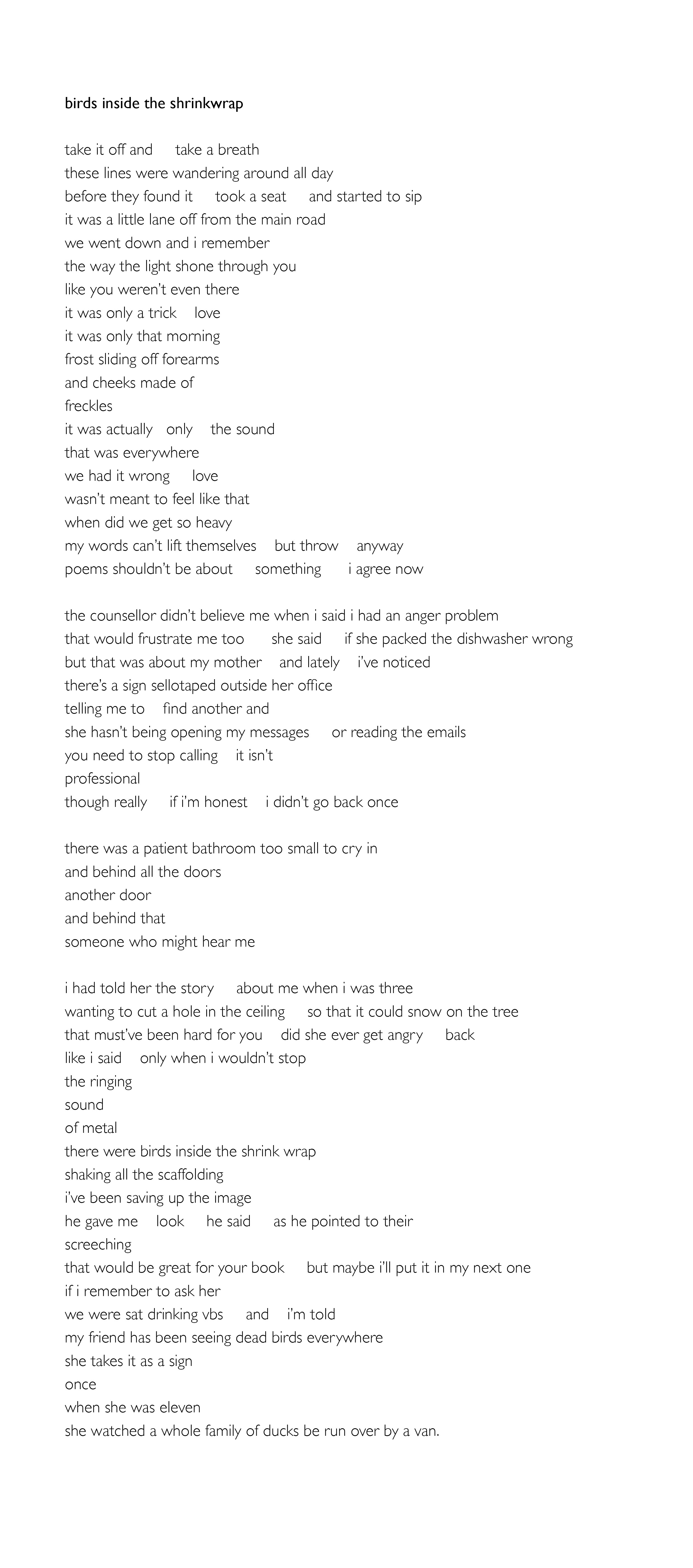 This poem crept up on me and gave me something new to chew on with every reading. It took me on more than one journey. The metaphors and alliteration were well done to create layers of love, anger, despair as the poet tried to both deal with life events and - use lines that had been wandering around all day - and create. As they said - there were birds inside the shrinkwrap/shaking all the scaffolding/ i’ve been saving up the image. We all do that.