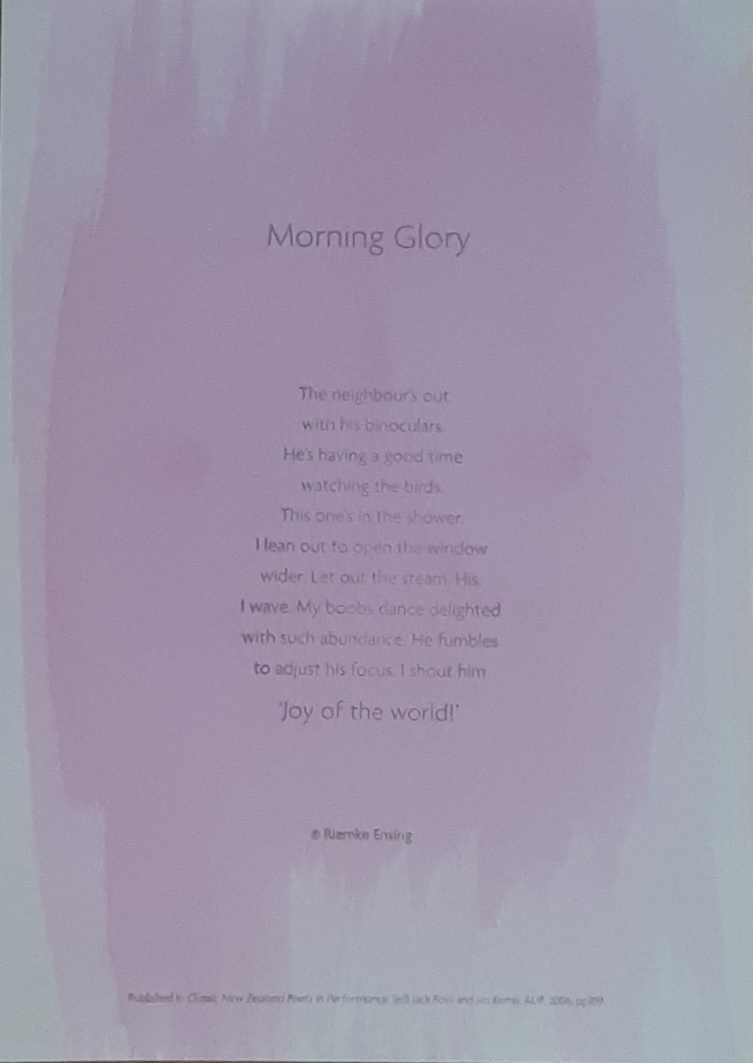 Poem: Morning Glory published in Classic New Zealand Poets in Performance. Editors Jack Ross and Jan Kemp. (AUP 2006)