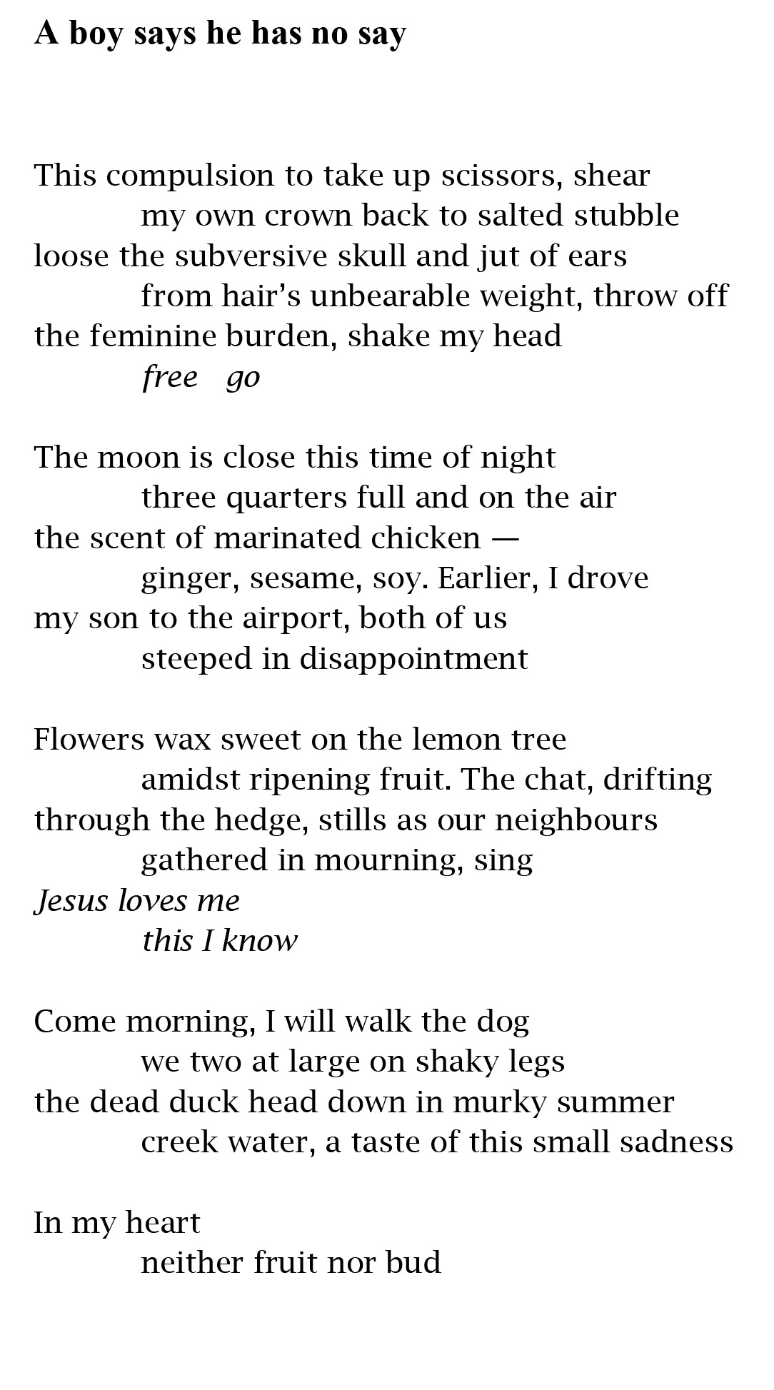 This is a delicate poem, with an enviable lightness of touch. The movement from one stanza to the next is gentle‚ and the suburban scenes, with hedges and lemon tree‚ are delightfully familiar. But this is also a poem with grit and a sadness ostensible if you rub away at the props. The deeper unfoldings are not explicit‚ but it is clear there is a turn of darkness here – ‘disappointment’‚ the neighbours ‘gathered in mourning’ and the ‘dead duck head down in murky summer’‚ the ‘small sadness … neither fruit nor bud’. This poem is a gut-punch, and kept igniting questions. Each time I read it I felt closer to its truth.